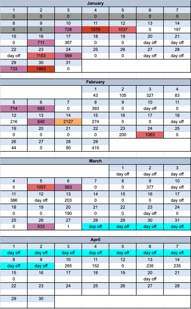 This is how I’m tracking the words I’ve written this year and you can see just how much I struggled. The highlighted blue area is when I intentionally wasn’t writing to prepare for the event, the day of the event, and the couple days I gave myself to recover. I have managed to write a little since getting back, but it’s not a perfect record. And I’m trying to accept the fact that that’s okay, but anxious brains suck at that kind of thing.