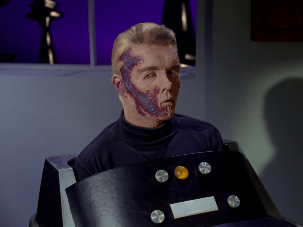 - It’s baffling to me that they don’t have the technology yet to help Pike—at least to give him a better quality of life. From a production standpoint, they probably couldn’t think of something to explaining healing Pike (the technobabble really reaches a peak in The Next Generation). From a retroactive standpoint, we can say they just hadn’t perfected the technology to deal with the specific type of radiation Pike was exposed to, and/or they weren’t able to get him help in time to stop the worst of his injuries from becoming permanent. But it does always seem a little weird when we’re in a technological future and come across something we think they should be able to heal/fix/deal with and they can’t.