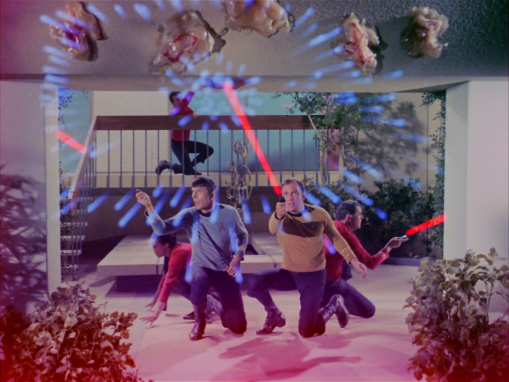 - This isn’t really a bad episode (it’s fine) but it’s extremely hard for me to take the rest of it as seriously after Spock gets blasted by glittery flower spores because it’s hilarious. We think of spores spreading in a delicate cloud, but this is violent air-cannon burst of glitter and it’s perfect. (This effect is in the same vein as the hand-puppet plant of Sulu’s earlier in the show.)