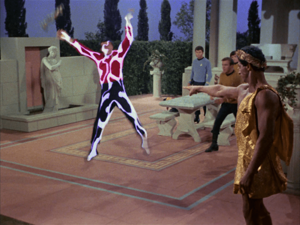 - I do not like this episode. First of all, we get the antiquated notion that a woman would have to leave Starfleet after getting married (sometimes I have to remind myself that the show was filmed in the 1960s and while it’s extremely progressive for the time, there are bits like that stick around), and then we have to deal with the absolute jackass who thinks he’s Apollo on the planet’s surface. Not to mention the sparkly neon togas/robes. Just. Ugh. Not the best episode.