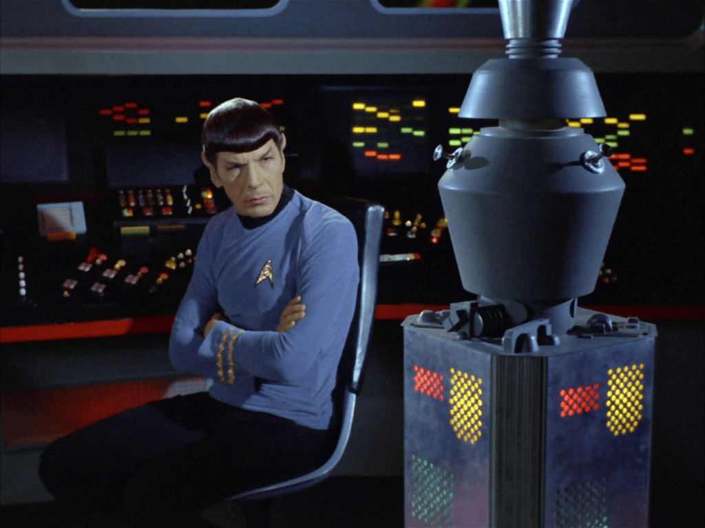 - The premise of this episode, that an Earth probe acquires intelligence by merging with alien tech, is basically the same as the beginning of Star Trek: The Motion Picture, where one of the Voyager probes acquires intelligence. Other stuff happens (that is similar to the season 1 episode “Where No Man Has Gone Before.” I said that in my thoughts about that episode too. I could be misremembering, but I guess we’ll find out when I get to the movies after season 3 of TOS.