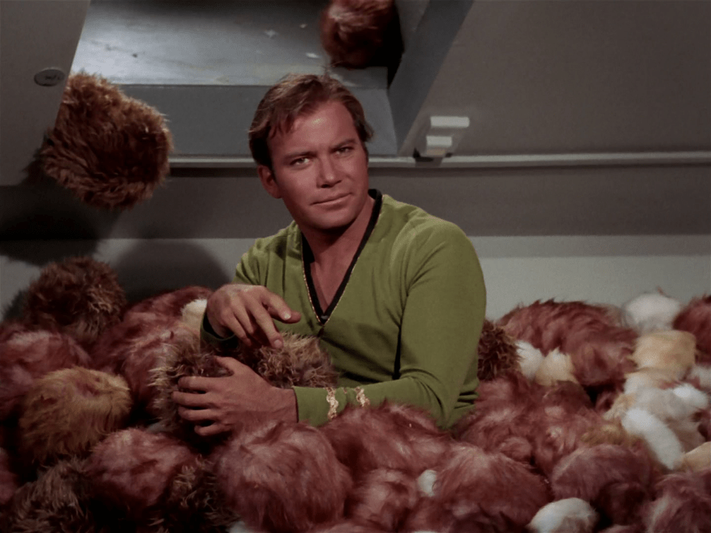 - This episode is basically Kirk trying to annoy a bureaucrat while keeping Klingons and Starfleet happy while his crewmen brawl with Klingons, the trader foists tribbles onto everyone without telling them how to keep them from breeding, McCoy and Spock try to study tribbles, and the tribbles get into the wonderful important grain. No wonder he has a headache. There’s no real antagonist other than the man who poisoned the grain and Cyrano Jones causing trouble; this is more of a slice-of-life episode and I kind of really wish there more of these.